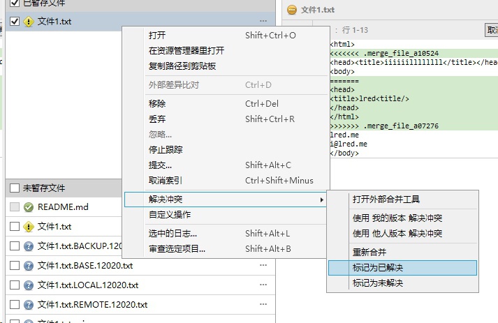 查看文件状态,显示有冲突的文件